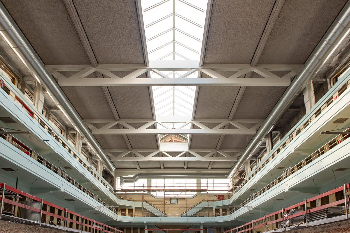 De verdeling van de ruimten wordt herzien op basis van een analyse van de werking van de instelling en de geschiedenis van de voorafgaande renovatiefasen: nieuwe familiecabines worden gecreëerd op het gelijkvloers, de cafetaria wordt opnieuw ingericht en nieuwe kantoorruimte voor het personeel worden ondergebracht in de uitbreiding op de 2de verdieping. De spatiale herinrichting maakt een intuïtieve lezing van de organisatie mogelijk en wordt vooral afgestemd op de nieuwe publieke ingang, opnieuw geplaatst aan de hoek van de Wipstraat en Fortstraat, zoals oorspronkelijk. Hij vindt zijn symmetrische positie in de as van het zwembad terug, zodat het historisch perspectief en de scenografie van de monumentale hal, die de zwemkuip overdekt, gewaardeerd worden.