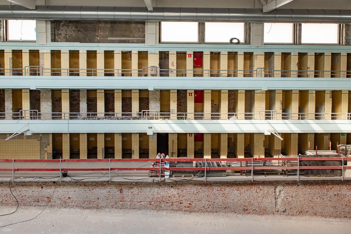 De trajecten en de scheiding tussen de voor het publiek toegankelijke lokalen en die voor het administratieve personeel zijn duidelijk. De trajecten voor de “naakte en geschoeide voeten» worden opnieuw gedefinieerd om het gebouw volledig toegankelijk te maken voor de personen met beperkte mobiliteit en ze te laten voldoen aan de hygiënische normen. Het licht en de kleuren zetten de historische ruimten nog meer in de kijker. De laterale brede vensters van de hal van de zwemkuip worden weer geopend dankzij het nieuw ventilatiesysteem. Voor de afwerking werd de keuze gemaakt op basis van de oorspronkelijke zachte blauwe en gele tonaliteiten van de faiencetegels en het schrijnwerk.